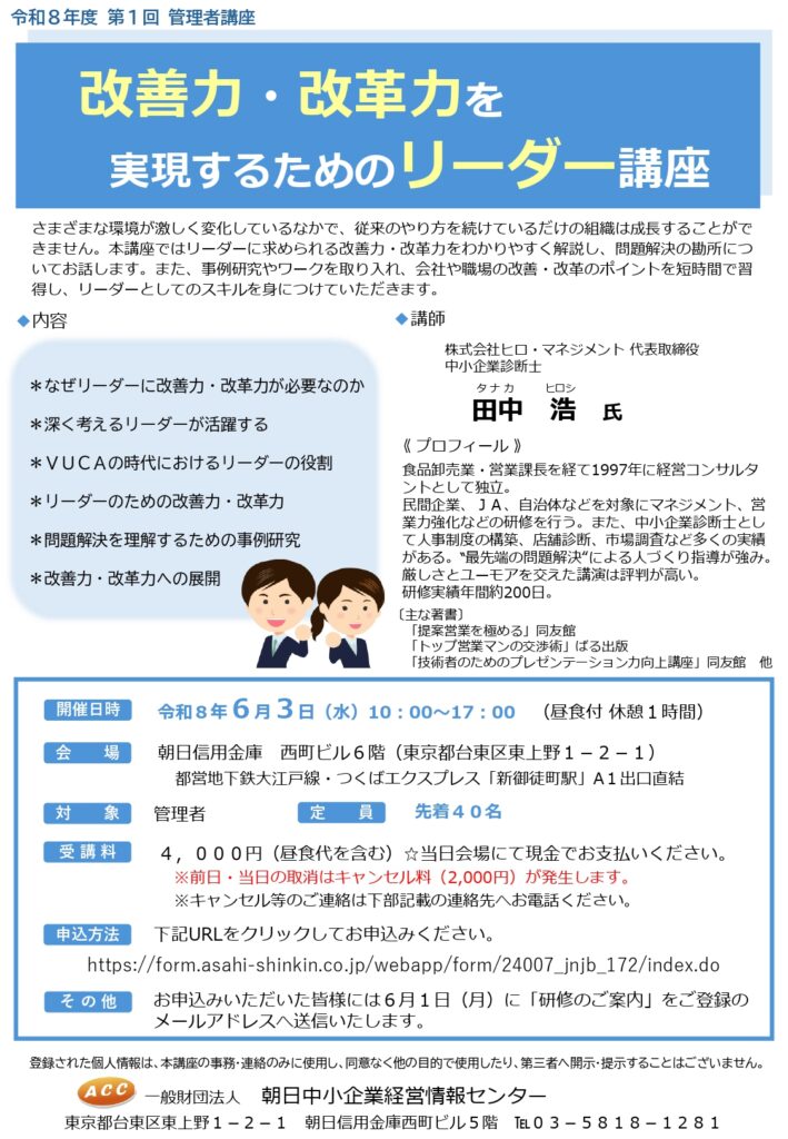 このたび、一般財団法人 朝日中小企業経営情報センター主催の管理者講座において、当社代表・田中が講師として登壇いたします。
