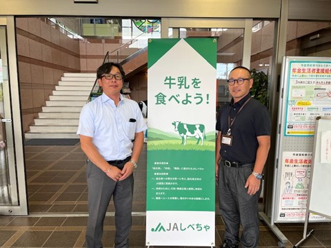 標茶町農業協同組合・代表理事組合長の鈴木重充(写真左)さんは、農協を引っ張る、若きリーダーです。職員の目線でも物事を考えることのできることから、農協内での人望があります。